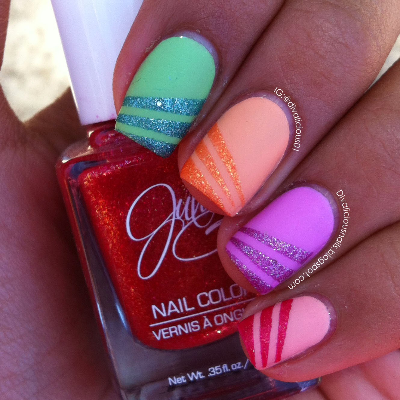 Products used: L-R Base colours = Sinful Colors - Pistache (2 coats), Kleancolor - Pastel Orange (2 coats), BC Co. - Shade 14 (2 coats) and BC Co. - Shade 8 (2 coats). Textured Polishes = Julie G - Rock Candy, Julie G - Tangerine Dream, Julie G - Crushed Candy and Julie G - Hot Cinnamon. I also used Striping Tape. Check out the Links page to find out where I got mine!